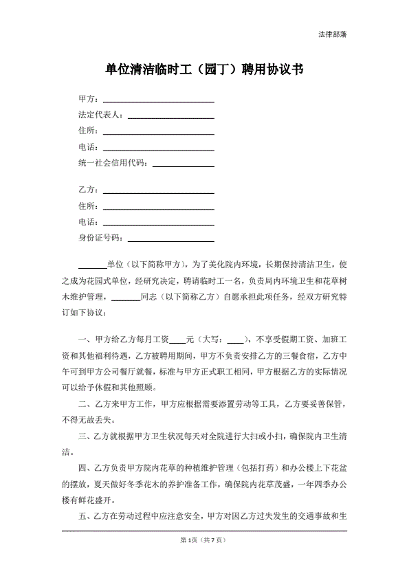 单位清洁临时工(园丁)聘用协议书