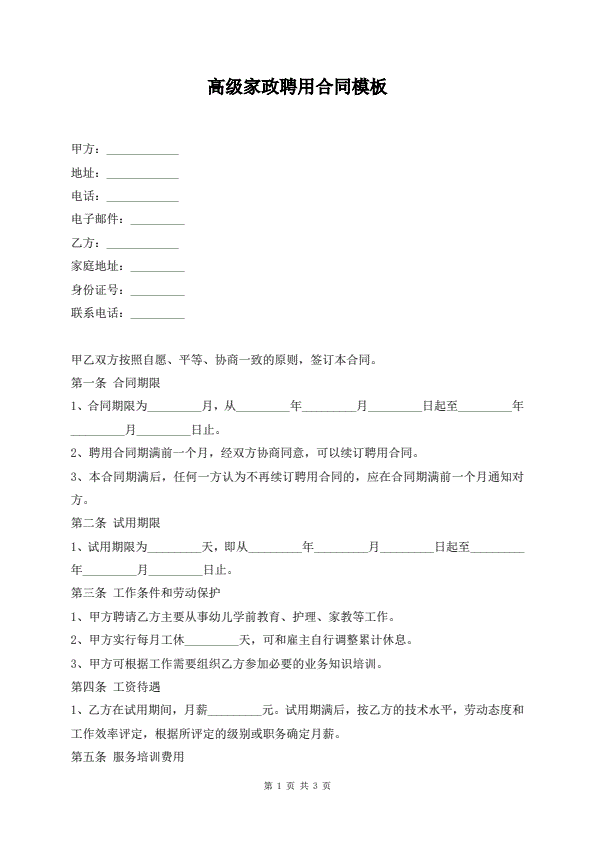 高级家政聘用合同模板