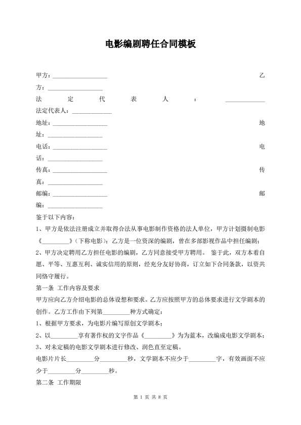 电影编剧聘任合同模板
