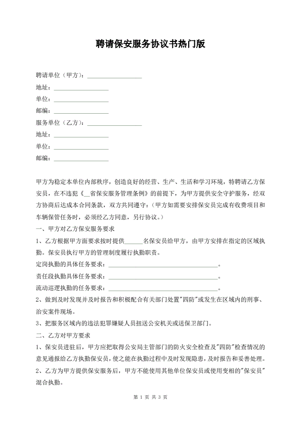 聘请保安服务协议书热门版