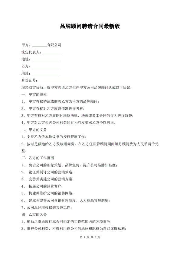 品牌顾问聘请合同最新版