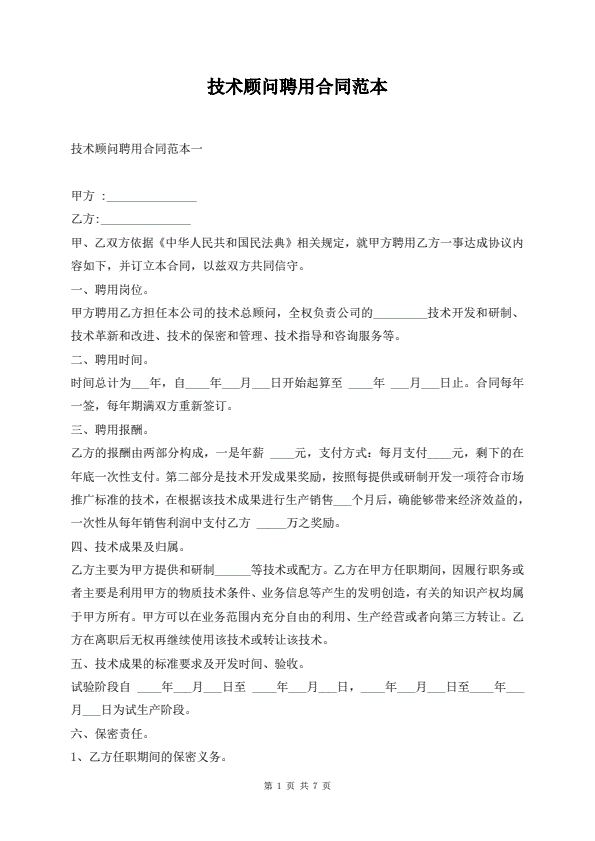 技术顾问聘用合同范本