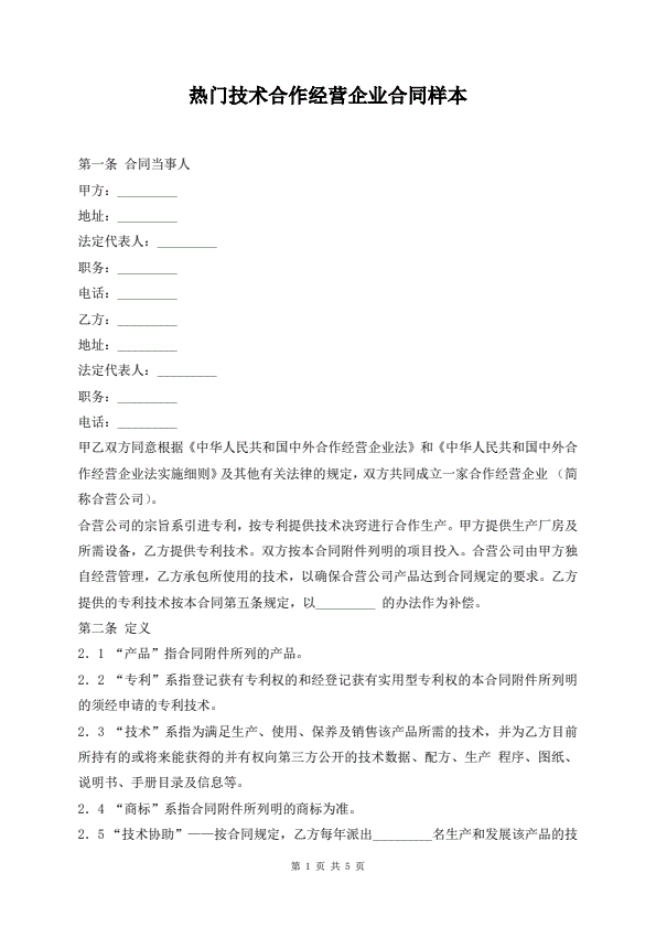 热门技术合作经营企业合同样本