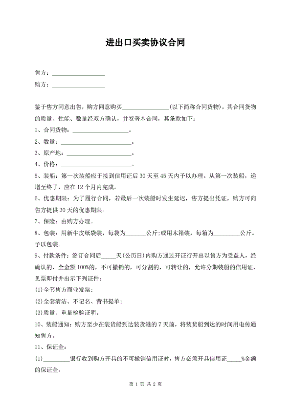 进出口买卖协议合同