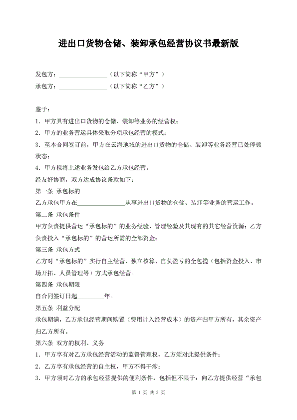 进出口货物仓储、装卸承包经营协议书最新版