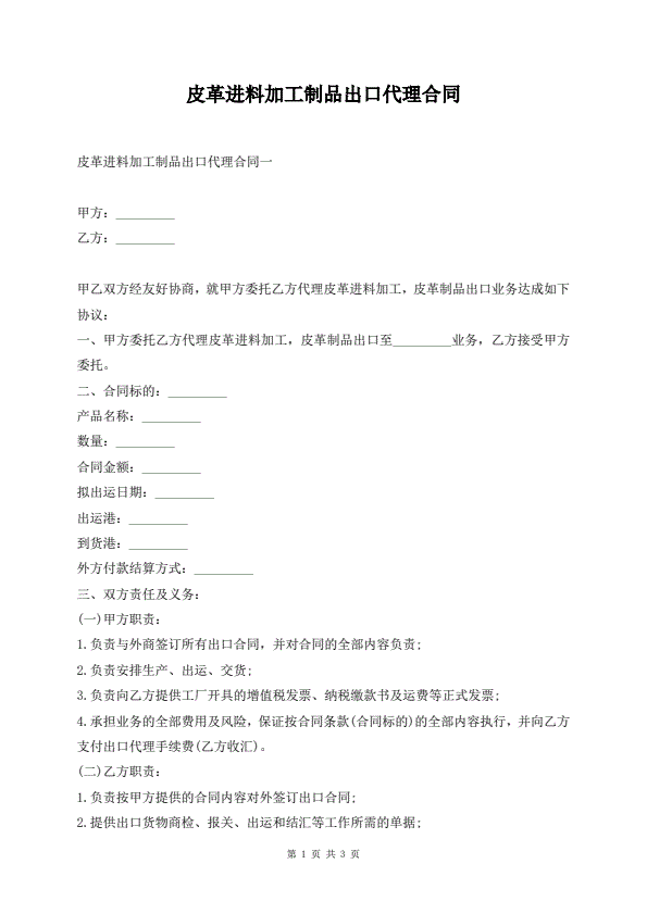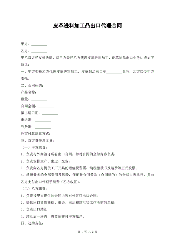 皮革进料加工制品出口代理合同