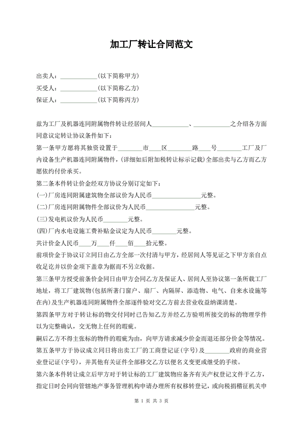 加工厂转让合同范文