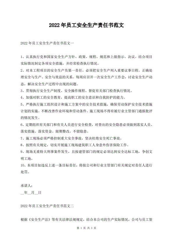 2022年员工安全生产责任书范文
