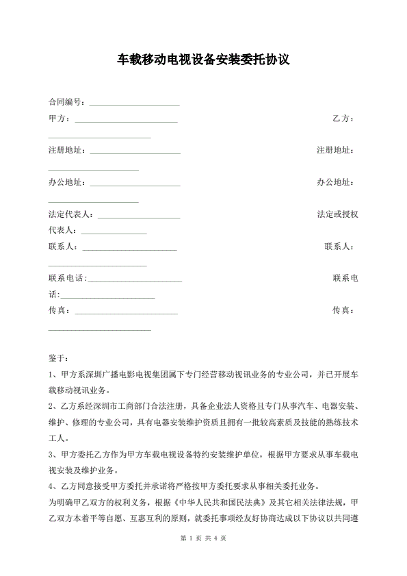车载移动电视设备安装委托协议