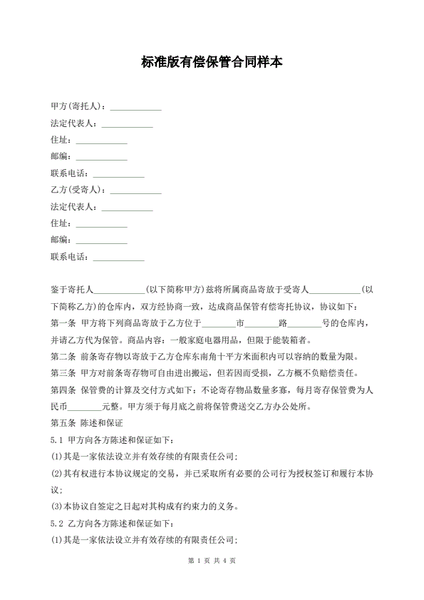 标准版有偿保管合同样本