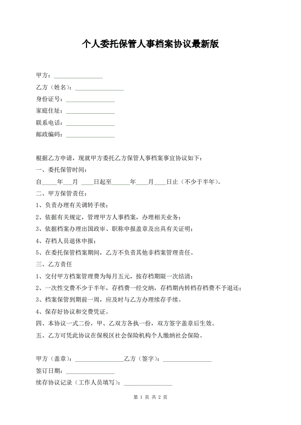 个人委托保管人事档案协议最新版