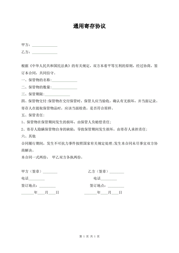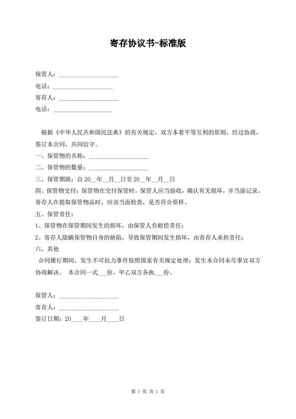 寄存协议书-标准版