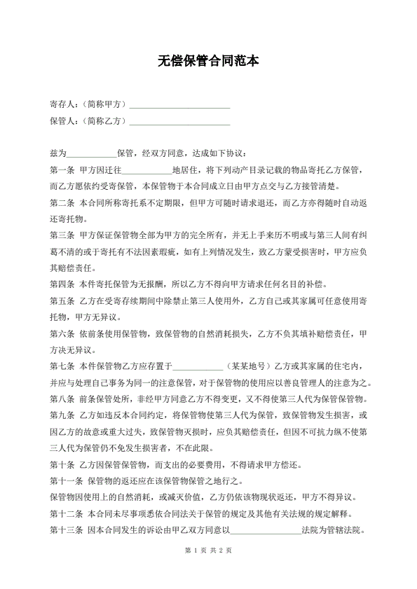 无偿保管合同范本