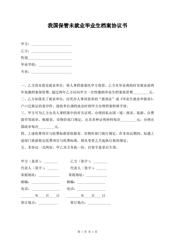我国保管未就业毕业生档案协议书