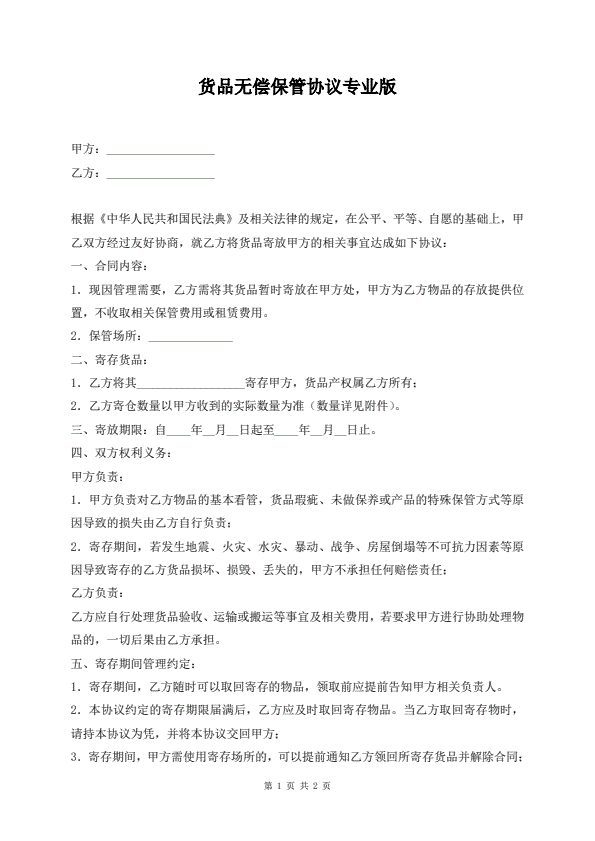 货品无偿保管协议专业版
