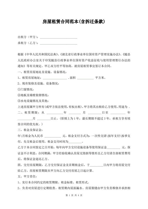 房屋租赁合同范本(含拆迁条款)