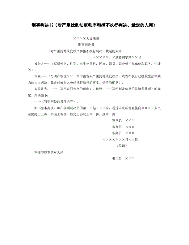 刑事判决书(对严重扰乱法庭秩序和拒不执行判决、裁定的人用)
