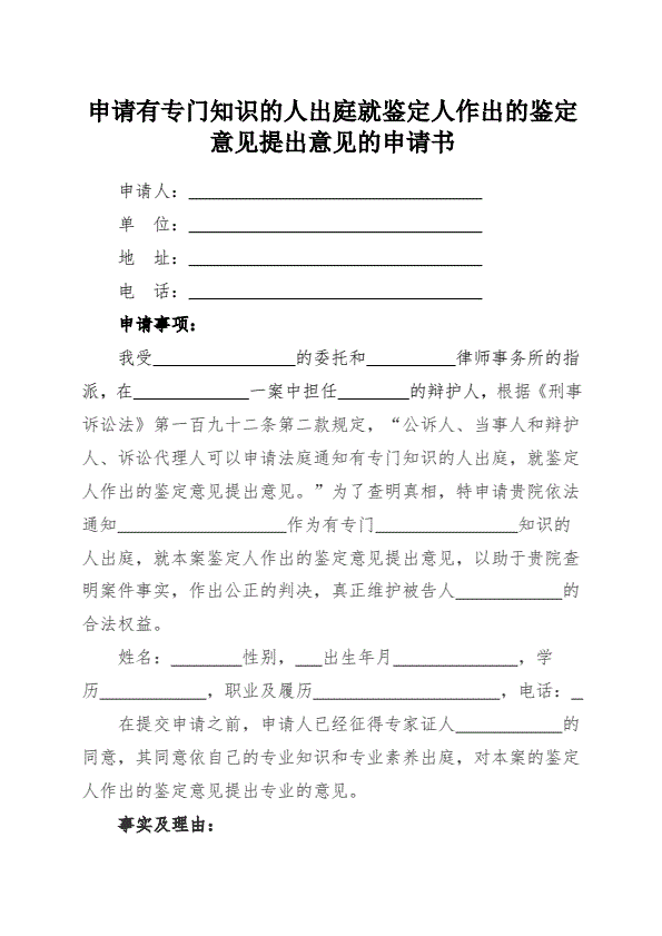 申请有专门知识的人出庭就鉴定人作出的鉴定意见提出意见的申请书