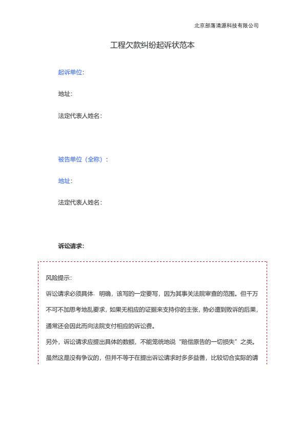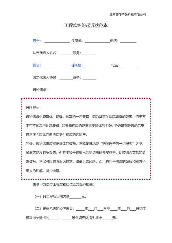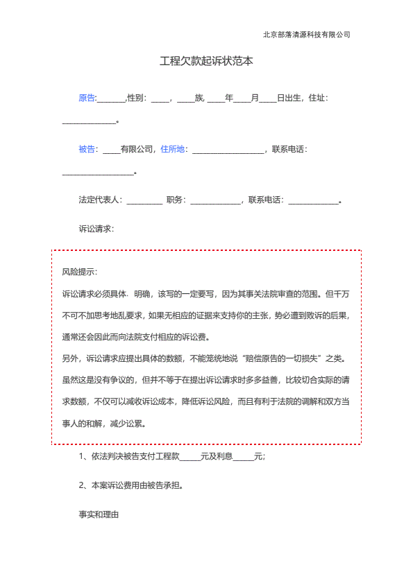 追讨工程款起诉状范本