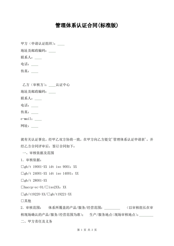 管理体系认证合同(标准版)