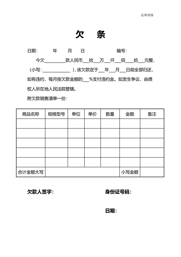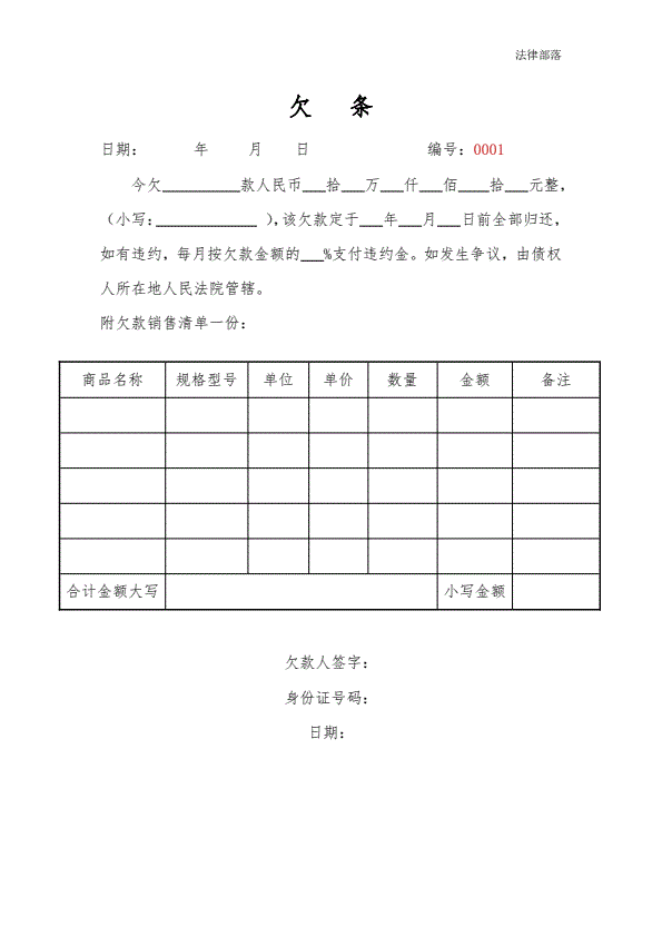 商品款欠条附带表格