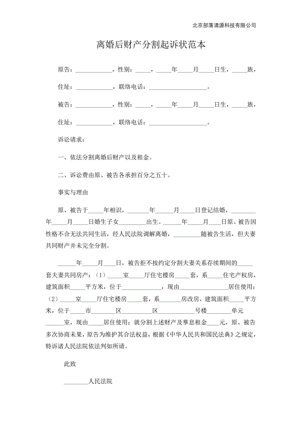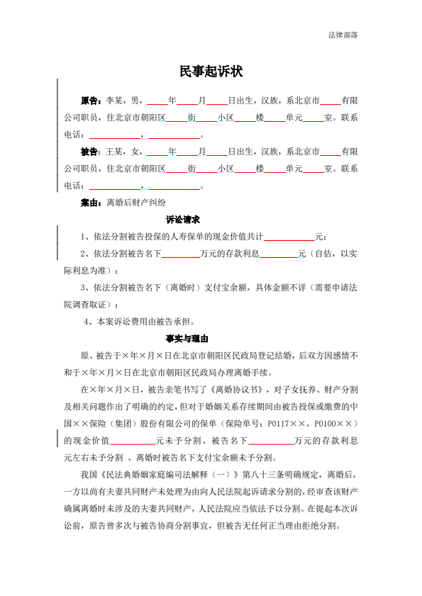 民事起诉状(离婚后财产纠纷)
