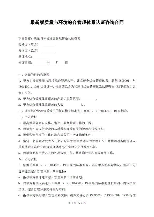 最新版质量与环境综合管理体系认证咨询合同