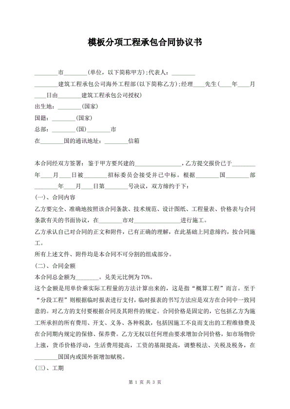 模板分项工程承包合同协议书