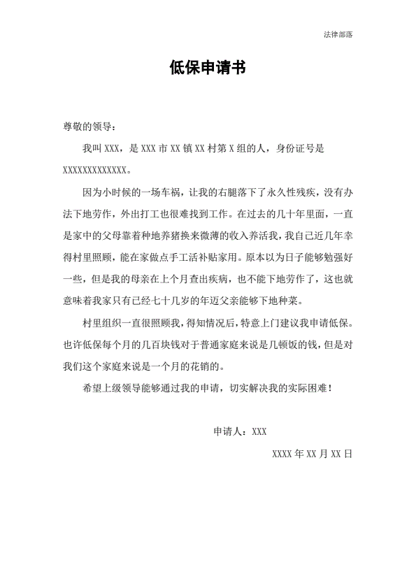 农村低保申请书模板