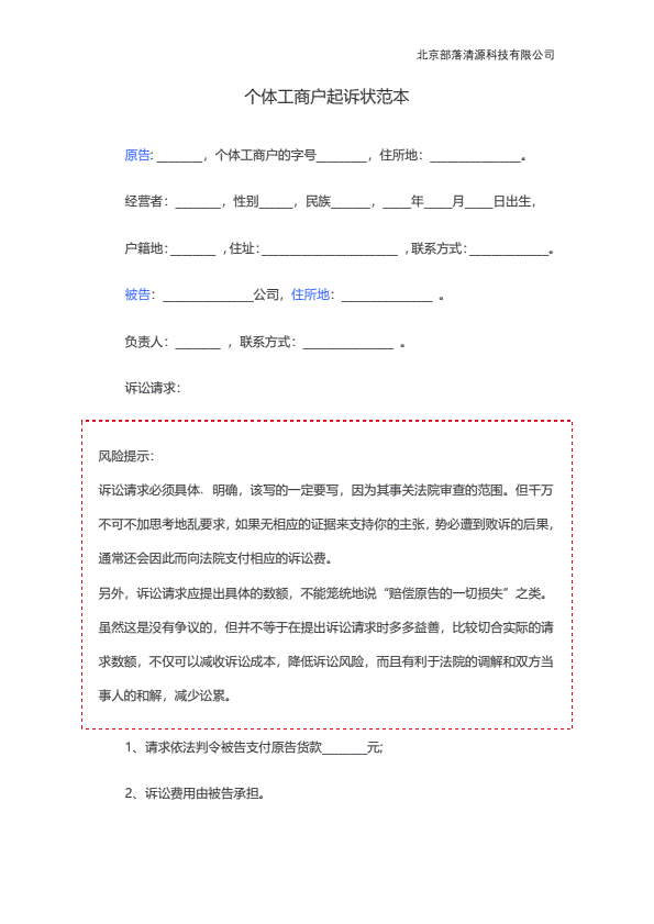 个体工商户起诉状范本