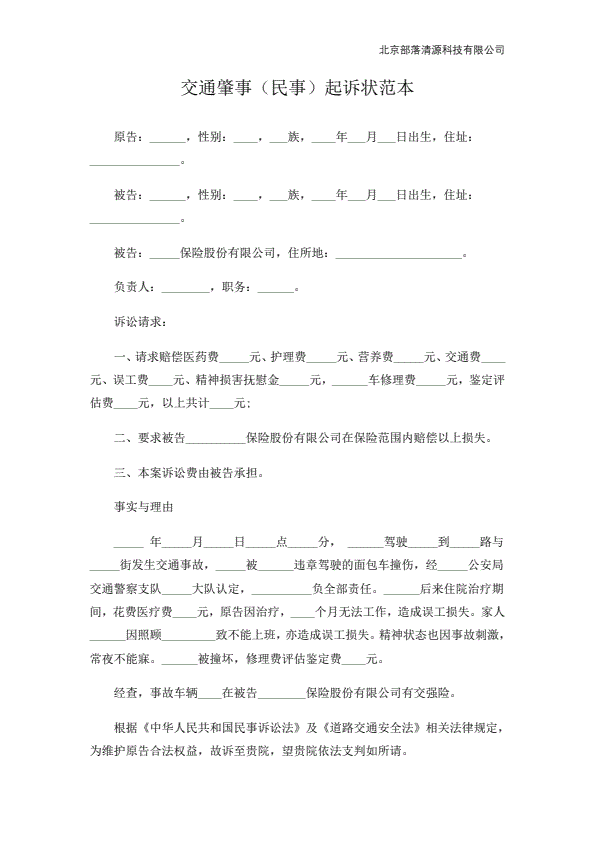 交通肇事(民事)起诉状范本