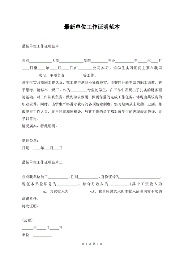 最新单位工作证明范本