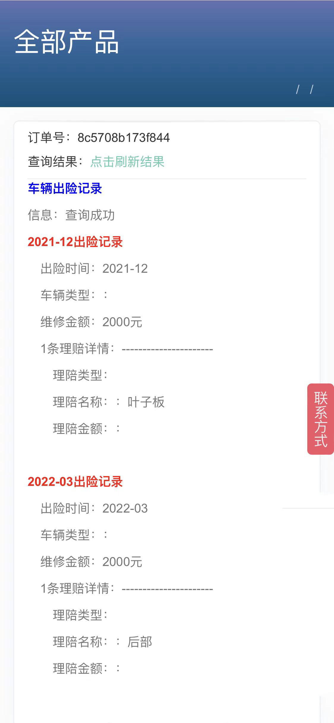 车辆出险记录查询是根据车架号查询车辆信息以及出险记录,包括出险时间、维修情况,维修金额及理赔信息等
